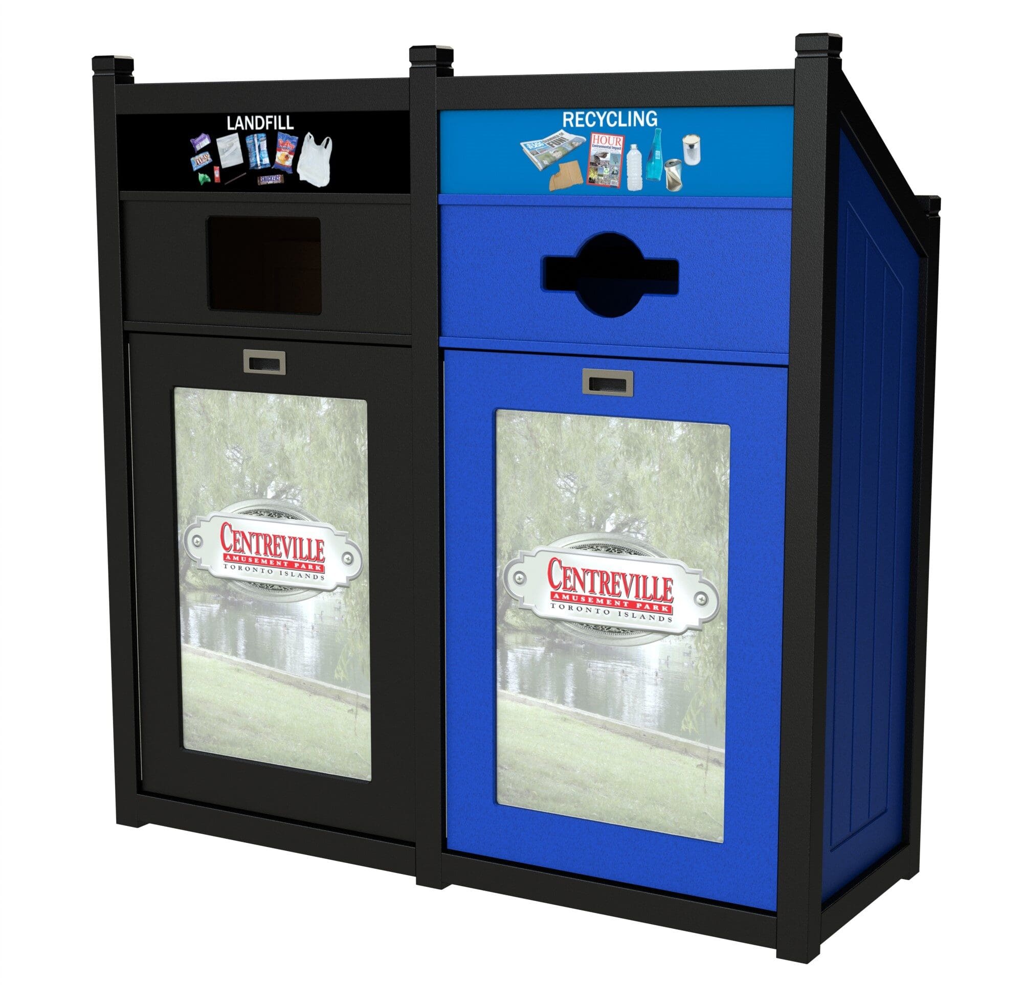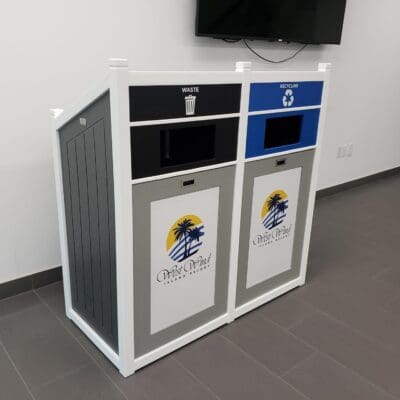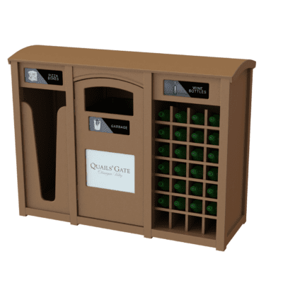 CleanRiver suggested a dome top recycling container to separate the recycling and garbage at the point of disposal. The units are attached so that the recycling and waste streams are always together even if the bins are moved, and the domed top prevents garbage from being left on top of the unit by visitors. The front opening door means the units are much easier to service; the liner pulls straight out for emptying rather than having to lift a heavy garbage bag up and out of the unit.